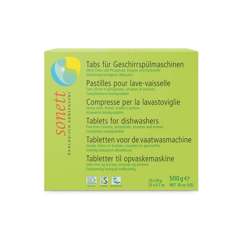 • SUITABLE FOR DISHWASHERS: Sonett Tablets for dishwashers free from chlorine, phosphates, enzymes and aromas. This suitable only for dishwashers with adjustable water softener and they contain minerals and fully biodegradable components.