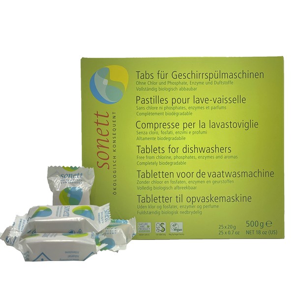 Sonett Organic Dishwasher Tablets 25 Count Deep Clean Dish Tab Fresh Scent 25 tablets x 0.67oz,18 fl.oz/ 500gr (5 Count)