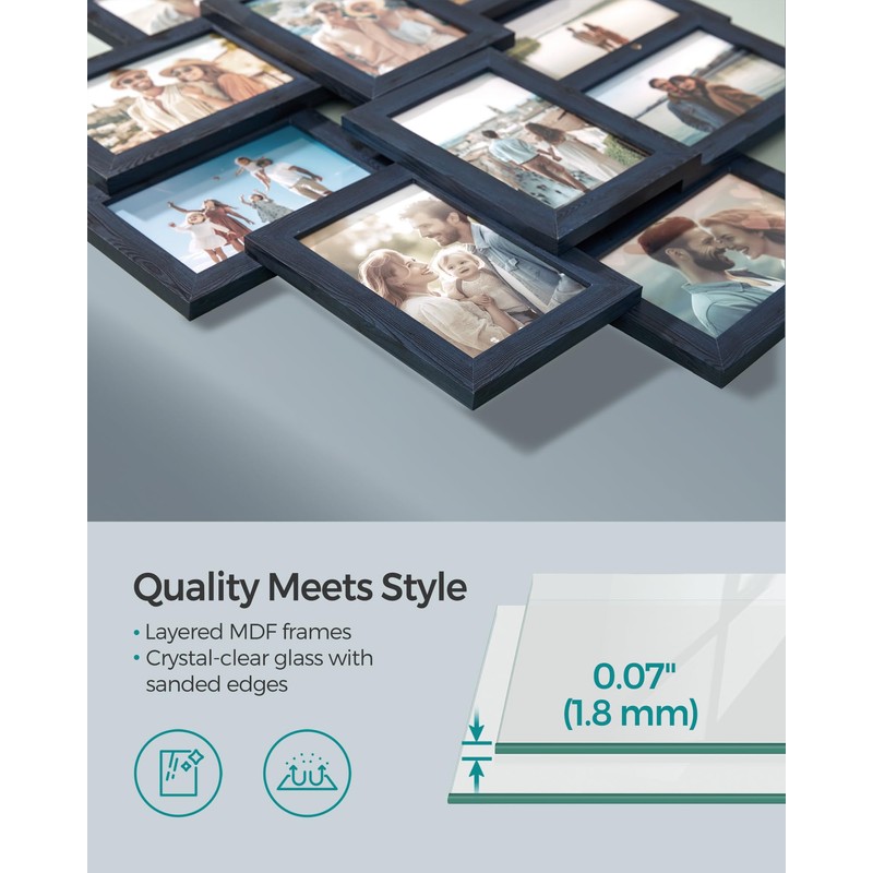 - [Quality and Clarity Combined] Made from thick MDF and high-transparency glass with sanded edges, these collage picture frames ensure your photos are displayed in crystal clear quality while ensuring safety during handling