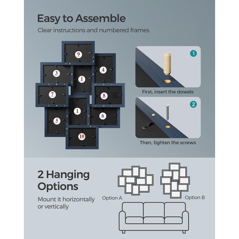 - [Stunning Display Made Effortless] With straightforward instructions and each frame numbered on the back, assembling this collage frame is easy, instantly enhancing your living room, bedroom, or office with a personal touch