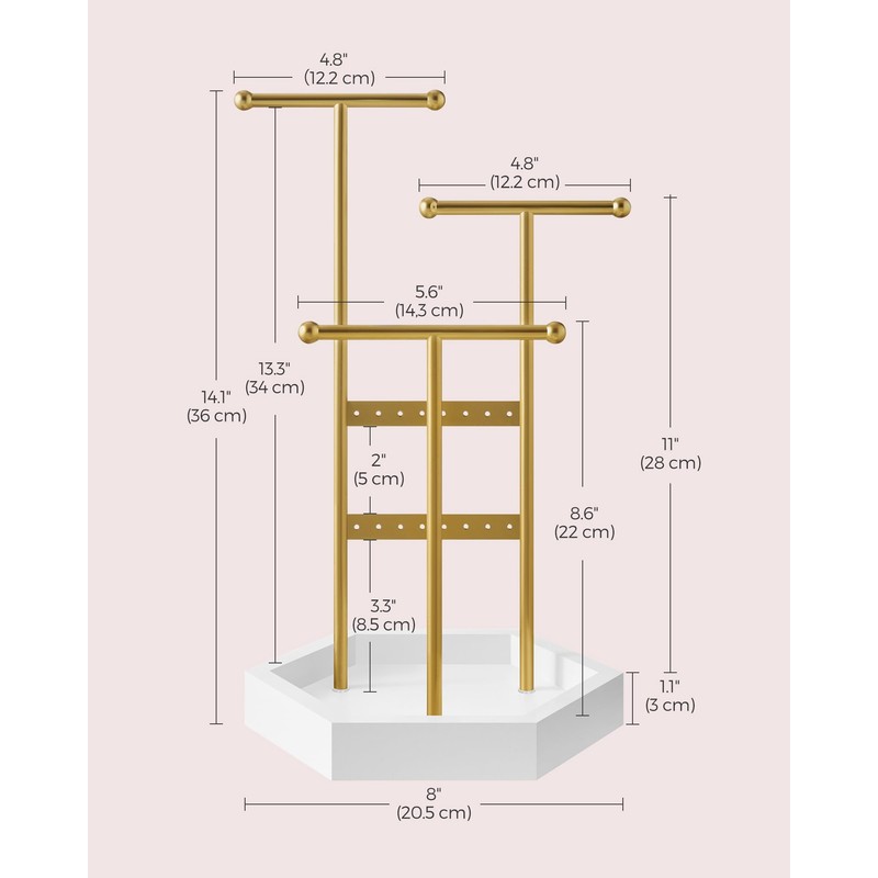 - [Sturdy, Durable, and Stable] The jewelry stand is a stable and safe haven for your treasured jewelry, thanks to a hexagonal base and 3 metal T-bars arranged in a triangular distribution and securely screwed to the base