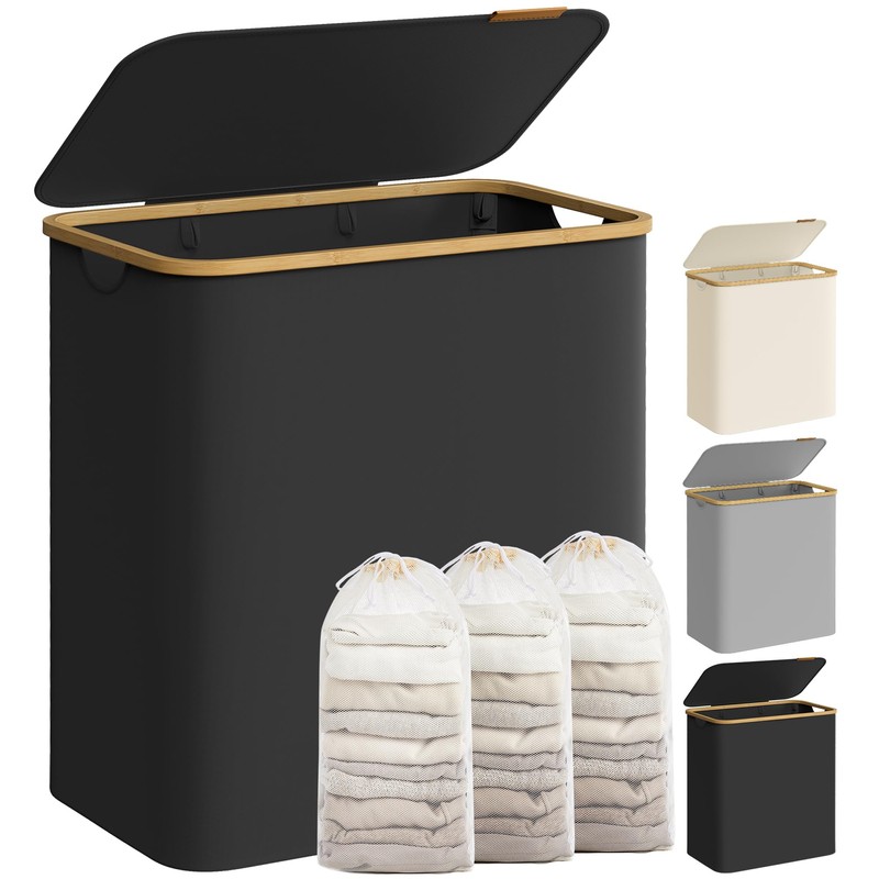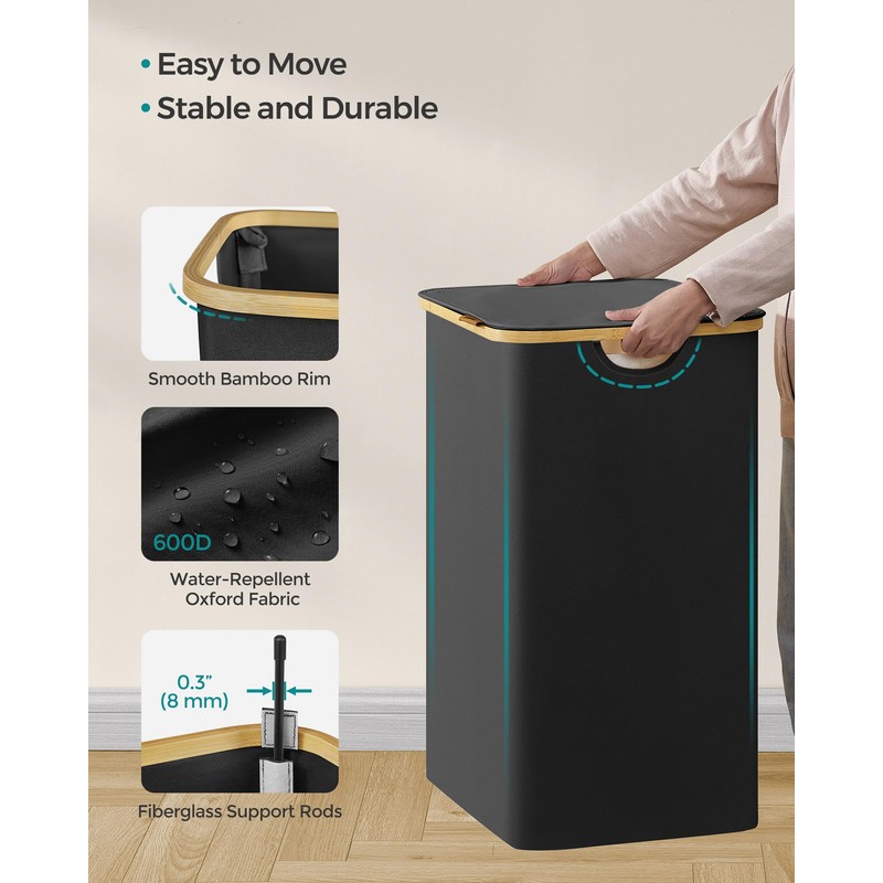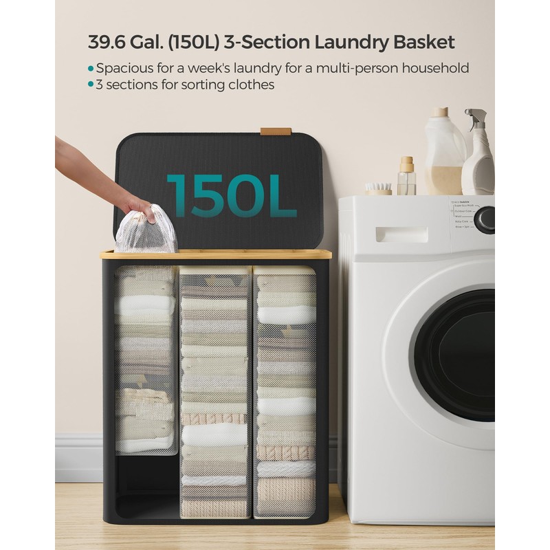 SONGMICS Laundry Hamper with Lid, 3-Section Large Laundry Basket, 52.8-gallon (150L), Removable Mesh Liner, Bamboo Handles, Collapsible, 23.6 x 15.2 x 27.8 Inches, Ink Black ULCB515B01