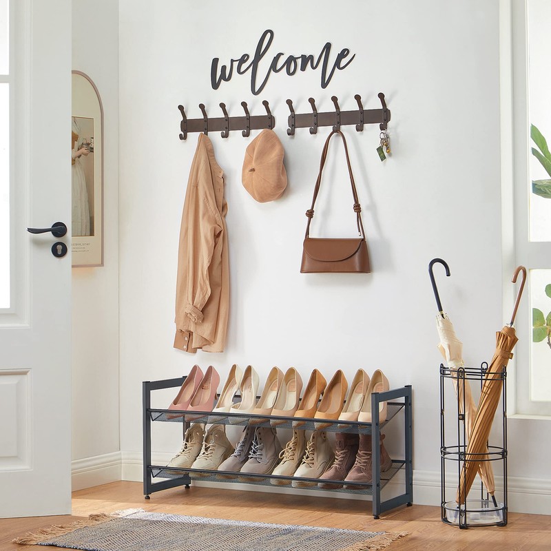 - [Multifunctional & A Color That Endures] 2 tiers shoe rack can store up to 10 women's shoes or 8 men's shoes, that even can hold books, sundries and drinks in the living room. SONGMICS metal shoe rack showcases a simple and clean design, stylish and versatile, adding a sophisticated touch to the living space