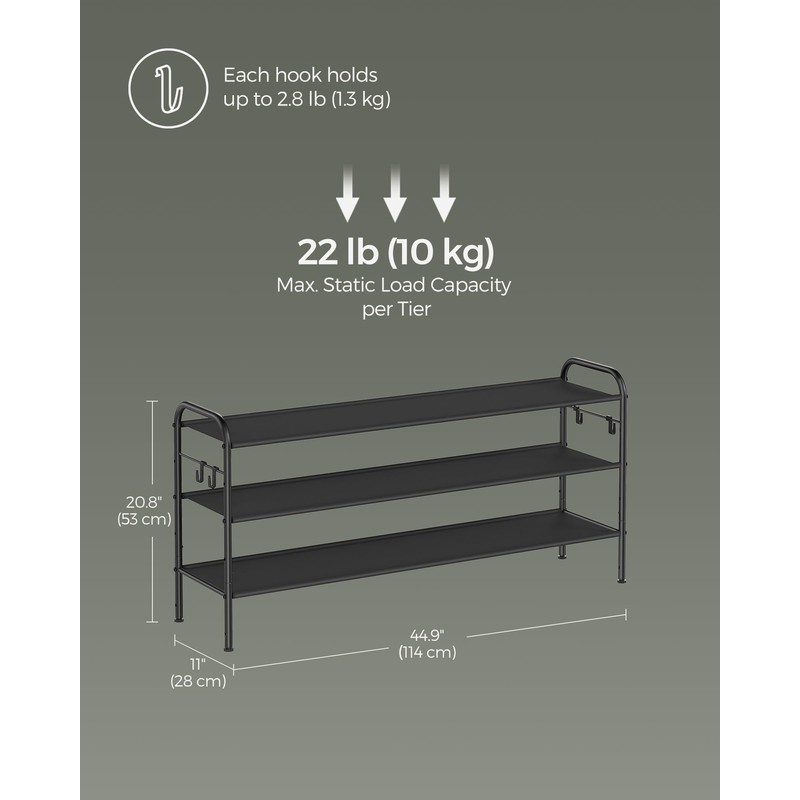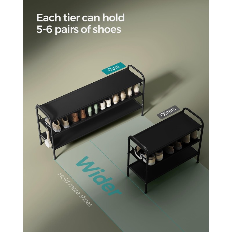 SONGMICS Shoe Rack, 3 Tier Shoe Organizer, Fabric Shoe Shelf Storage with 4 Hooks, Holds up to 18 Pairs of Shoes, Height-Adjustable Shoe Rack for Entryway, Hallway, Closet, Easy Assembly, Ink Black