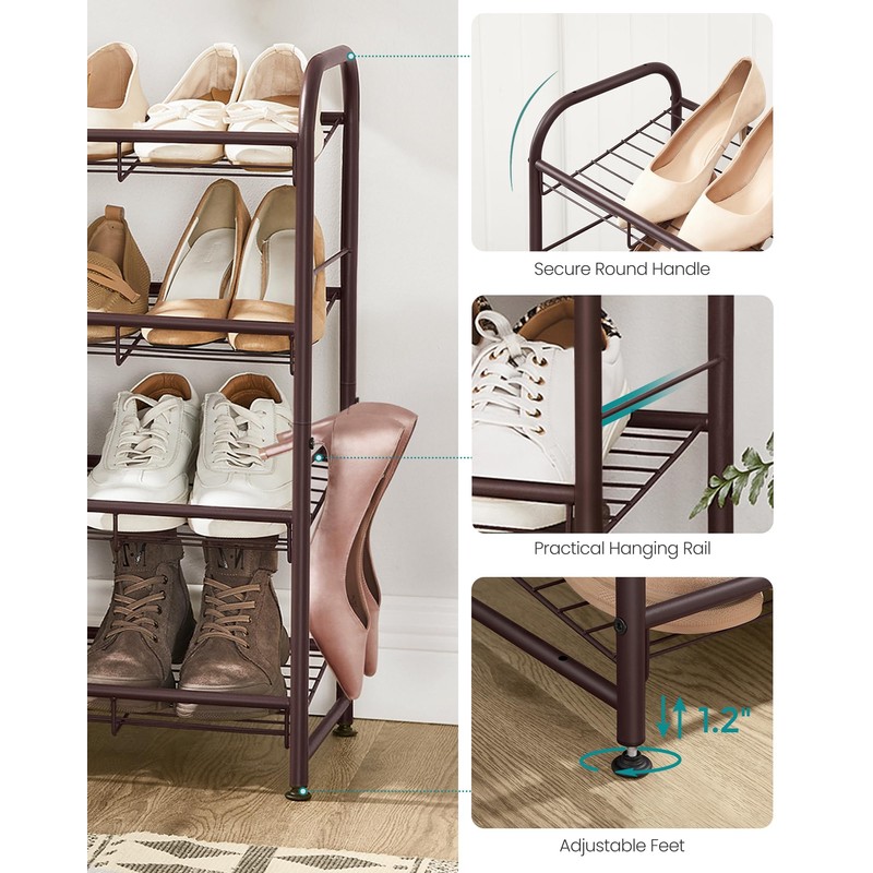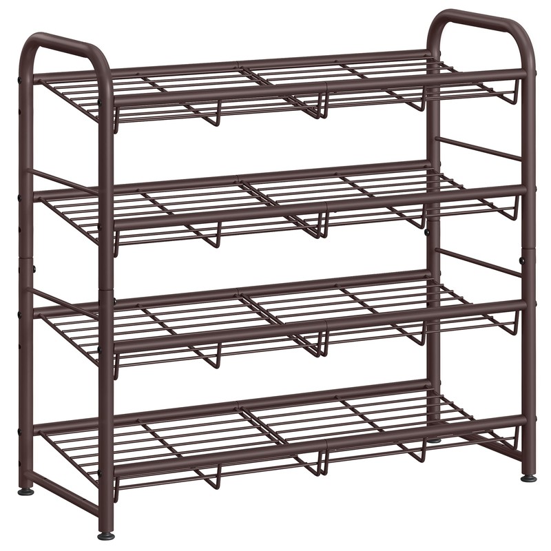 - ROBUST SHOE ORGANIZER This shoe rack is made of thickened metal frame, wire grid and adjustable feet, ensuring reliable stability. Hold up to 30 lb for each shelf, with additional bottom storage for more shoes, 4 tiers shoe rack can store up to 12-16 pairs of shoes