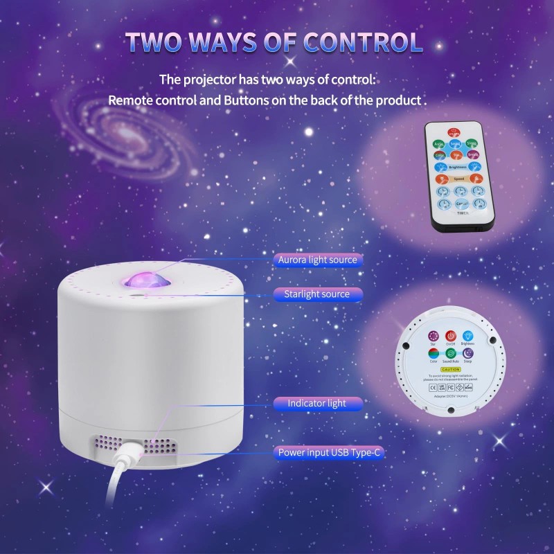 - Star Night Light ProjectorProjector has two ways of control: buttons on the back of the product and remote control. When you want to quickly adjust and control the product, the back button turns the power on and off, and adjusts the color of the light, the selection of stars and nebulae, and the sleep mode function on.