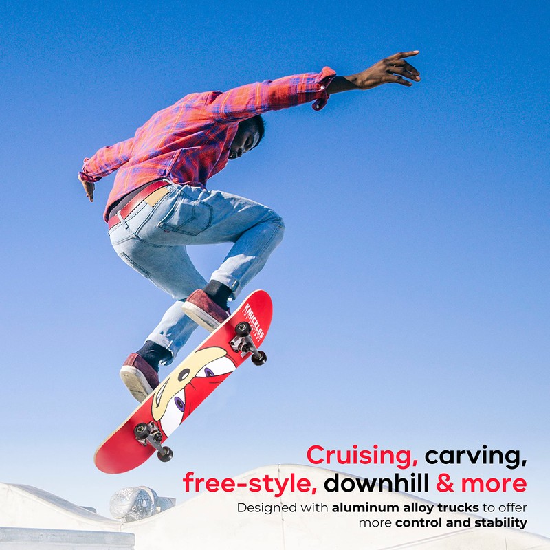 - Versatile: The skateboard is suitable for all skill levels. The skateboard provides just the right fit for Cruising, Carving, Free-Style, Downhill, and more while staying stylish the super cool graphics; it's designed with aluminum alloy trucks to offer more control and stability when riding