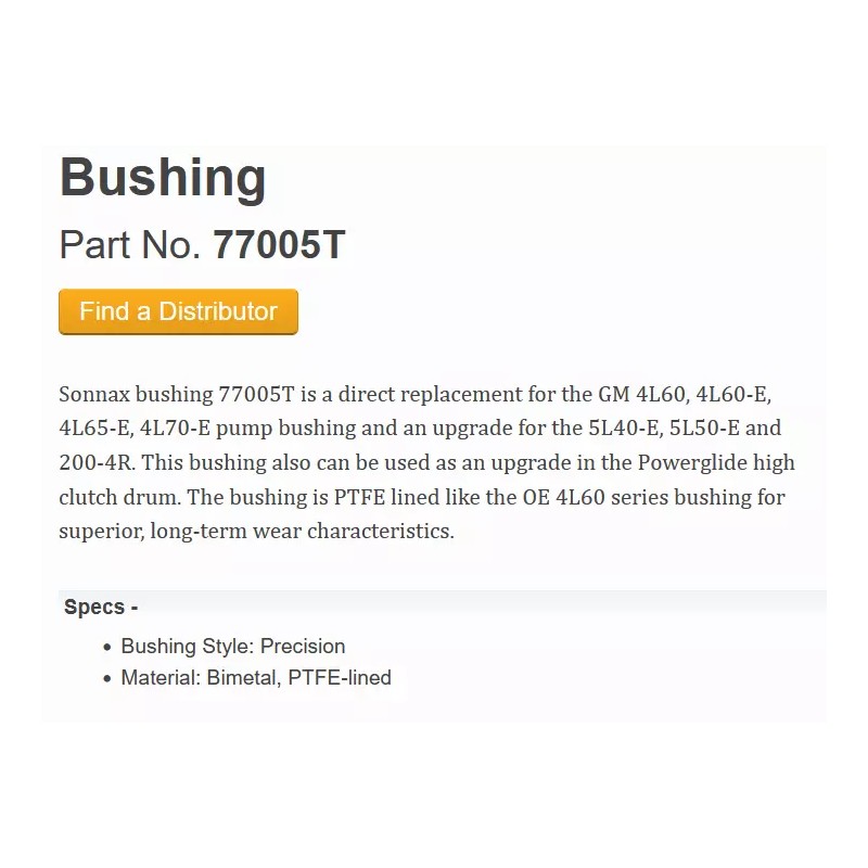 Sonnax bushing 77005T is a direct replacement for the GM 4L60, 4L60-E, 4L65-E, 4L70-E pump bushing and an upgrade for the 5L40-E, 5L50-E and 200-4R. This bushing also can be used as an upgrade in the Powerglide high clutch drum. The bushing is PTFE lined like the OE 4L60 series bushing for superior, long-term wear characteristics.- Material: Bimetal, PTFE-lined