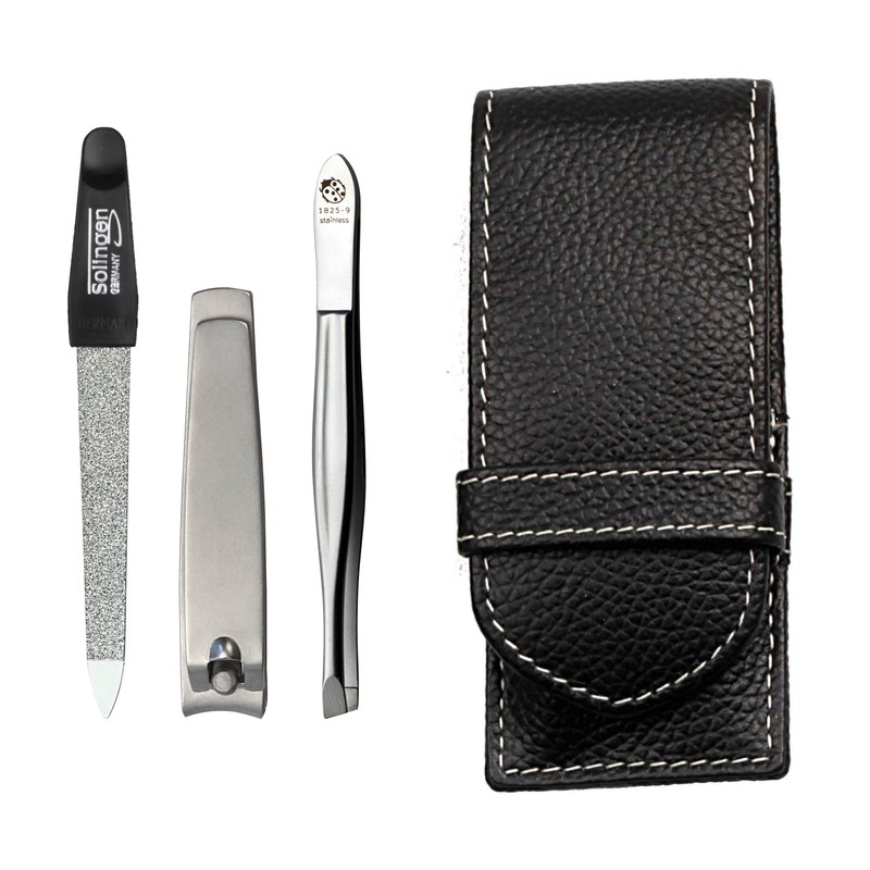 Sonnenschein by Hans Kniebes - Manicure Set 3 Pieces - Nail Clippers, Nail File and Tweezers - Pocket Manicure Nail Care Set - Real Cowhide Leather Manicure Case Black