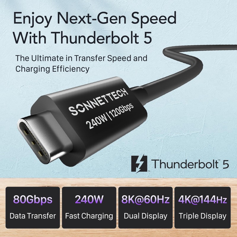 Unlock next-level performance with the Sonnet Thunderbolt 5 Cable, delivering cutting-edge speed, power, and versatility for today’s most demanding workflows. Supporting up to 80Gbps of bi-directional data transfer and up to 120Gbps of video bandwidth with Bandwidth Boost, this cable is built for professionals who require maximum throughput for high-res video editing, 3D rendering, and data-intensive tasks. With support for up to one 4K display at 540Hz, two 8K displays at 60Hz, or three 4K displays at 144Hz, this cable transforms your visual setup with stunning clarity and ultra-smooth refresh rates. USB Power Delivery 3.1 enables charging up to 240W, making it a powerhouse for laptops, tablets, and other USB-C devices—perfect for simplifying your workspace with one ultra-capable cable. Compatible with Thunderbolt 3, Thunderbolt 4, USB4, and USB-C devices, it offers universal connectivity without compromise. Backed by Intel Thunderbolt certification, the Sonnet Thunderbolt 5 Cable is engineered for long-term durability, stable signal integrity, and professional-grade performance.
