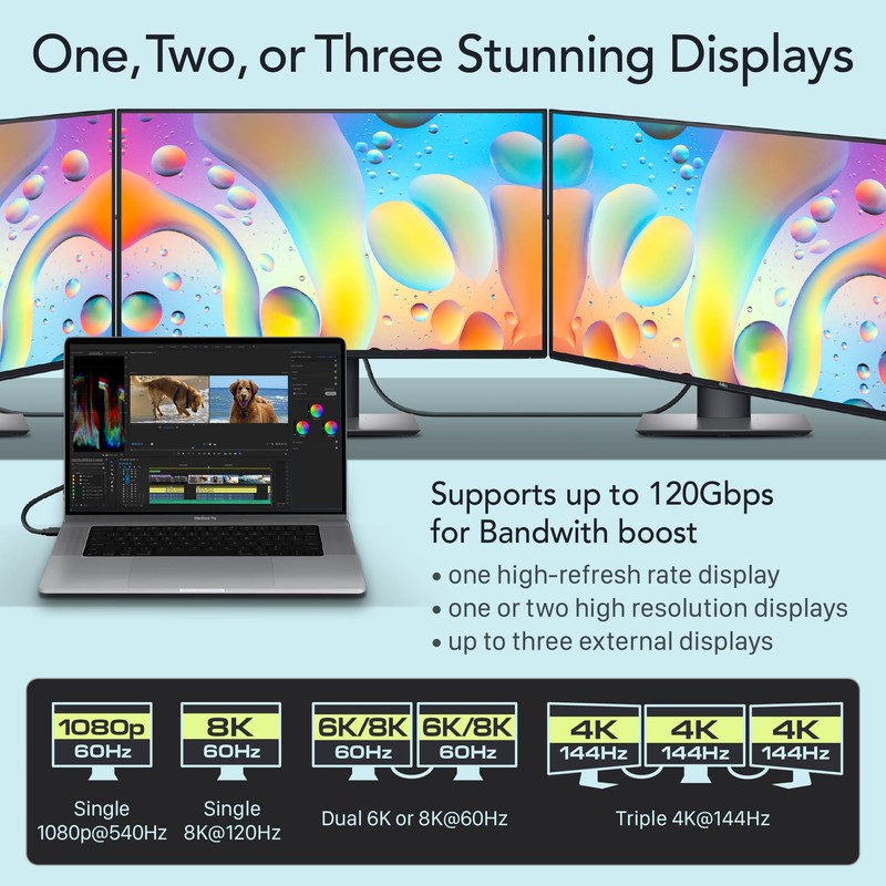 • Multi-Display 8K Support: Connect one 4K display at 540Hz, two 8K displays at 60Hz, or three 4K displays at 144Hz with a single cable—delivering crystal-clear visuals and ultra-smooth refresh rates. Perfect for video editors, 3D animators, and content creators, this Thunderbolt 5 cable supports the bandwidth and resolution demands of the most visually intensive workflows.