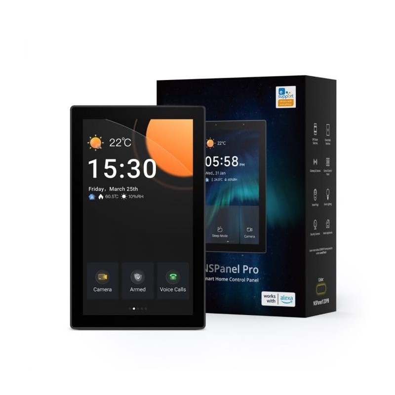 NSPanel Pro is an intelligent stage control panel that integrates a touch screen, Zigbee hub and intelligent security features. You can control devices by adding them as widgets on the panel, adding various Zigbee sub-devices via the built-in Zigbee gateway, set security modes to protect your home, and view the live view on the panel via an added camera. Compatible with more brands and with more practical functions such as energy consumption statistics, thermostats, call system, etc.