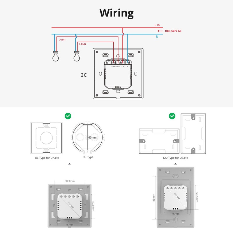SONOFF T5 Interruptor de Pared Inteligente, Interruptor de Luz Táctil WiFi, Interruptor Fuego Cero,el Panel es Extraíble y Reemplazable, Modo de Iluminación Ambiental, Efectos de Luz T5-2C-120