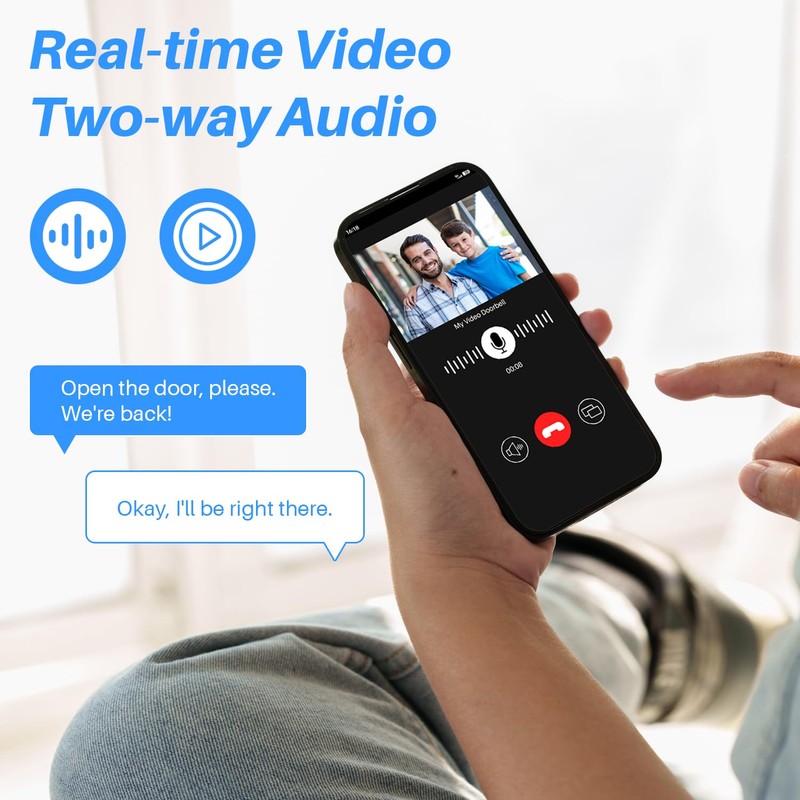 • Two-Way Audio: Doorbell camera allows you to see real-time video of your door and talk to visitors. Even when you're not at home, You can communicate with visitors or emit a sound to scare away strangers at your door through the doorbell camera.