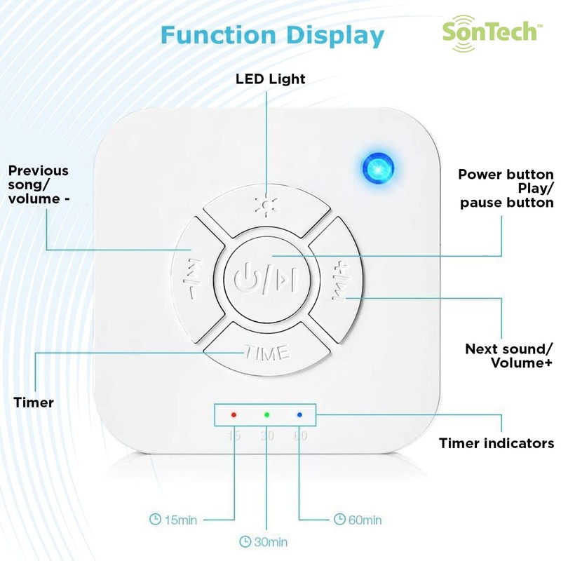 SonTech - White Noise Sound Machine - 10 Natural Soothing Sound Tracks Home, Office, Travel, Baby – Multiple Timer Settings - Battery or Adapter Charging Options