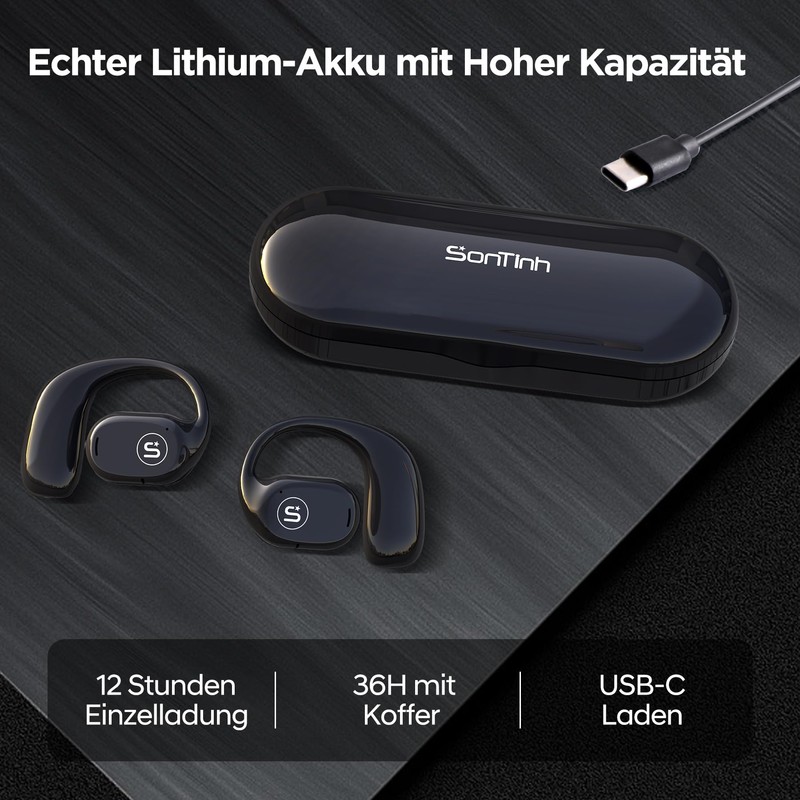 - Real high-performance battery inside the open ear headphones: Each Sontinh OpenAir earphone has a large built-in 100 mAh battery with up to 12 hours of playback time on a single charge. The charging case can charge the earplugs twice, allowing a total battery life of up to 36 hours via the convenient USB-C standard port.