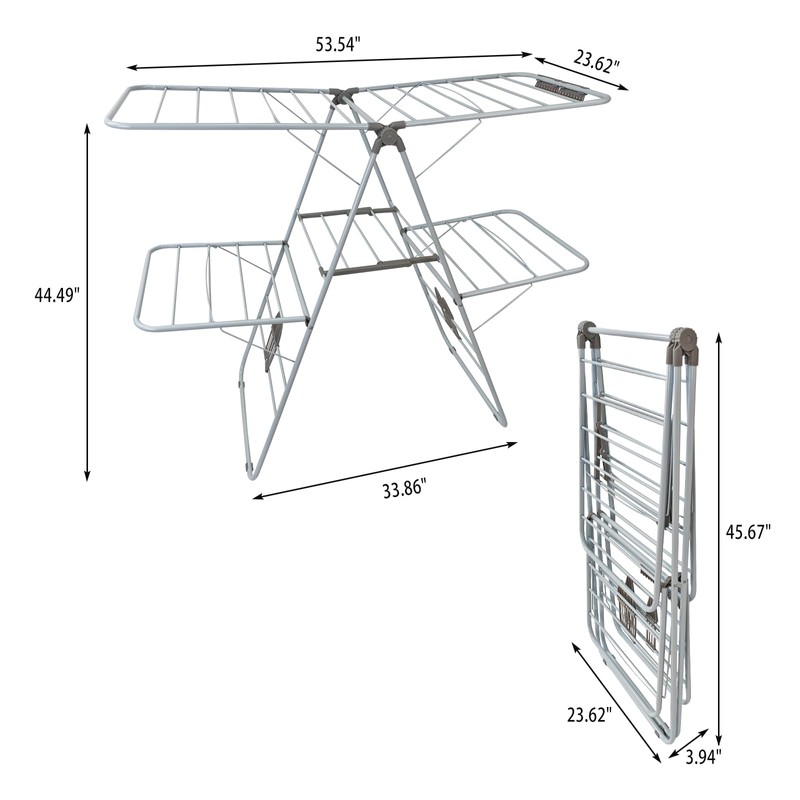 This extra large capacity double tier drying rack is the ultimate solution for home drying! Featuring a double-tier design with multiple thickened drying rods and non-slip clips, it can easily accommodate the whole family's laundry, including large items such as sheets, duvet covers and towels, as well as small items such as underwear and socks, to meet the need for a large amount of washing at one time, and to completely solve the problem of insufficient space on the balcony. Whether it is for daily use or to deal with a large number of washing, this drying rack is easily capable of doing the job, and is a must-have double-drying artifact for families. The drying rack is made of thickened stainless steel tubing with anti-rust coating treatment on the surface, which is sturdy and durable, and is fearless of wind and rain erosion. Folded thickness of only 10 cm, can be easily stored under the bed, cabinets or wall corners, especially suitable for small homes, rentals, dormitory use, but also convenient to carry when traveling and camping, practicality is extremely strong. Whether you are at home or outdoors, this drying rack can meet your needs. The top two wings support multi-step height adjustable design, which can be freely adjusted according to the length of the clothes, whether it is a long windbreaker, dress, pants, or short-sleeved T-shirts, shirts, can be hung perfectly, avoiding the clothes dragging on the ground or wrinkles, keeping the clothes flat as new. Flexible height adjustment function makes drying more convenient and adapts to various types of clothes. The scientific design of the drying rod with drainage holes and shoe rack function accelerates air circulation and improves drying efficiency; the middle widened net rack can be laid flat to dry sweaters, baby clothes and other easy to deform fabrics, avoid hooking and deformation, and take care of the quality of the clothes, which is a good and thoughtful helper for housewives and baby moms. Ventilation and quick drying design makes clothes dry faster and saves time, especially suitable for busy modern families. Whether it's an indoor balcony, outdoor patio or terrace, this drying rack can easily cope with it, adapting to a variety of environments, indoor and outdoor universal, durable and cost-effective. If you are looking for a practical, durable and functional drying rack, this extra large capacity double drying rack is definitely the ideal choice for you!