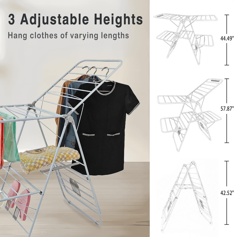 • Height Adjustable, Flexible Adaptation: The top two wings support multiple height adjustments to adapt to different lengths of clothes, whether it is a long skirt, pants or short sleeves, can be hung perfectly and keep the clothes flat and wrinkle-free. The height adjustable design makes drying more flexible and meets diversified drying needs.