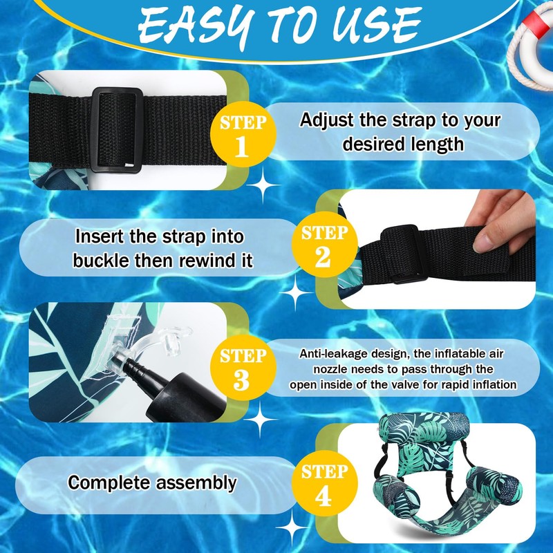 - Adjustable Back and Head Support: each pool float seat has 2 adjustable straps, just adjust the length of the straps to adjust your sitting position or fully recline; Designed to accommodate people of different heights, allowing you to find a comfortable size; Suitable for taking on vacation or for lounging by the poolside on a sunny day