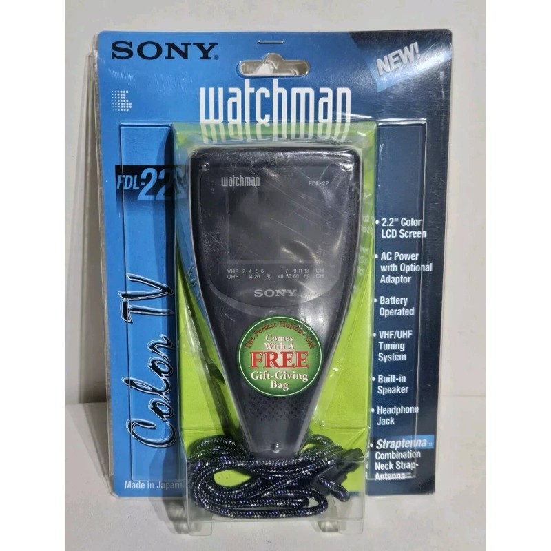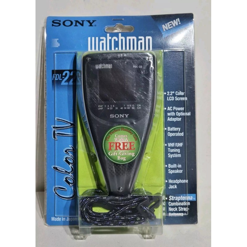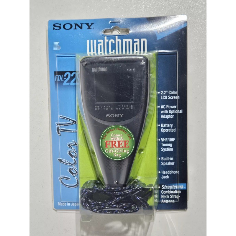 Up for sale is a vintage 1994 Sony Watchman FDL-22H charcoal gray LCD color TV. Battery operated. Built-in speaker. Headphone jack. 2.2" color LCD screen. Neck strap. VHF/UHF tuning. TV is new in package. Package shows light storage wear. TV will most likely not get reception because channels are now digital. Please feel free to ask questions. Thank you.