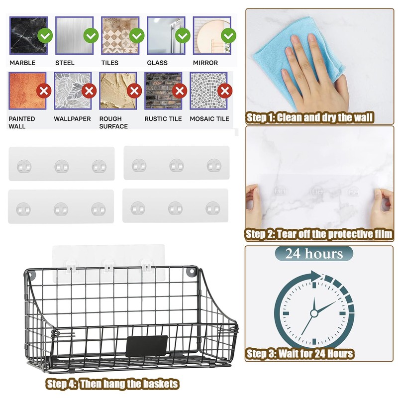 - 4 Powerful No-Scratch Stickers We are equipped with 4 pack high-quality, very strong adhesive, non-marking stickers. You can rest assured that hanging them on the wall will not cause collapse or damage. It's worth noting that these stickers are suitable for various types of walls, including marble, steel, tiles, glass, mirrors, and more. For walls such as painted wallspaperwall and so on that are not suitable, you can be fixed baskets with wall studs.