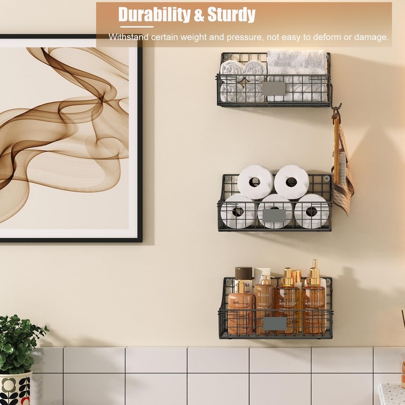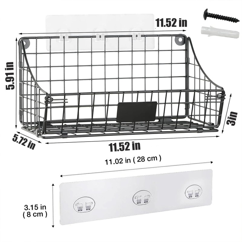- Wide Open Design&Dimension: Made with a sturdy wire metal frame, this wire storage baskets features a low front and high back to keep your items neatly tucked away and easily accessible. Each basket size: 11.4 x 5.5 x 5.5 inch, clean the wall basket with damp cloth and towel.