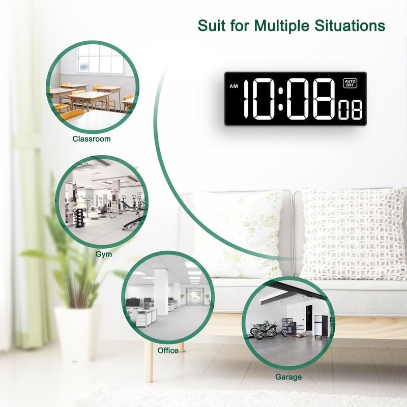 - - Soobest LED digital wall clock has a 10 inches large led screen display with 3 inches eye-catching number display, there is no doubt that you can see it from any angle or at any indoor-distance, and the digit size is also big enough to recognize. Besides, you could check date & year on the screen, no worries about missing important appointment.