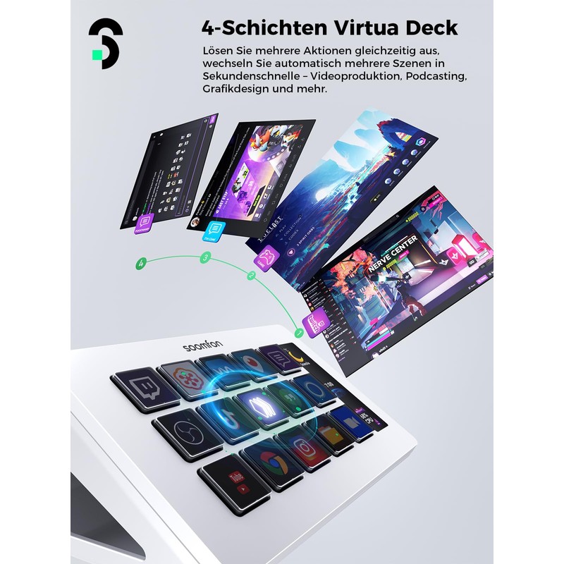 - Save time and work more efficiently: If you want to optimise your workflows and use time more effectively, the SOOMFON Stream controller deck is just the thing for you. It allows you to control software and tools, trigger actions, play audio clips, and adjust audio settings all from a single device. Put an end to the chaos and take your work to the next level!