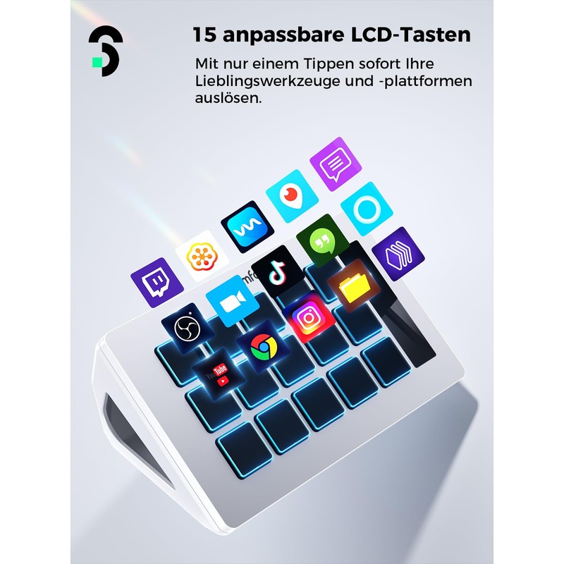- 15 adjustable LCD macro buttons: With 15 macro keys, you can easily control your software, tools and platforms without annoying window changes. Each button is equipped with an LCD screen that you can customize with your favourite images – according to your taste, with a minimum size of 126 x 126 pixels. Make your control more personal and efficient!