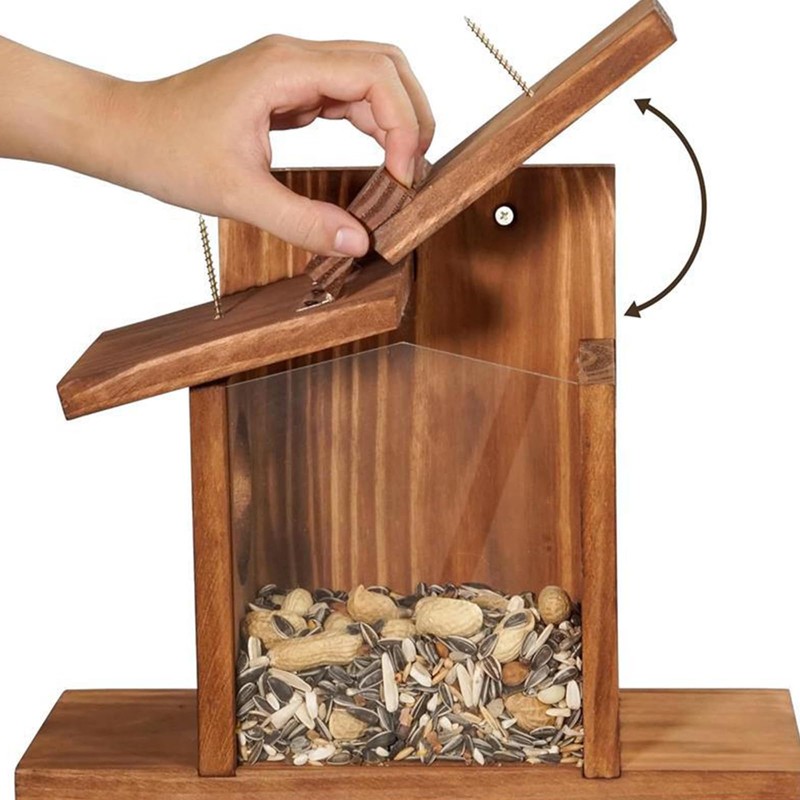 Easy Refilling and Rain Protection: The upper right side of our squirrel feeder can be easily opened for refilling or closed securely to prevent rainwater from entering. This thoughtful design not only makes it effortless for you to add more food but also ensures that the feeder remains dry and functional during inclement weather conditions.