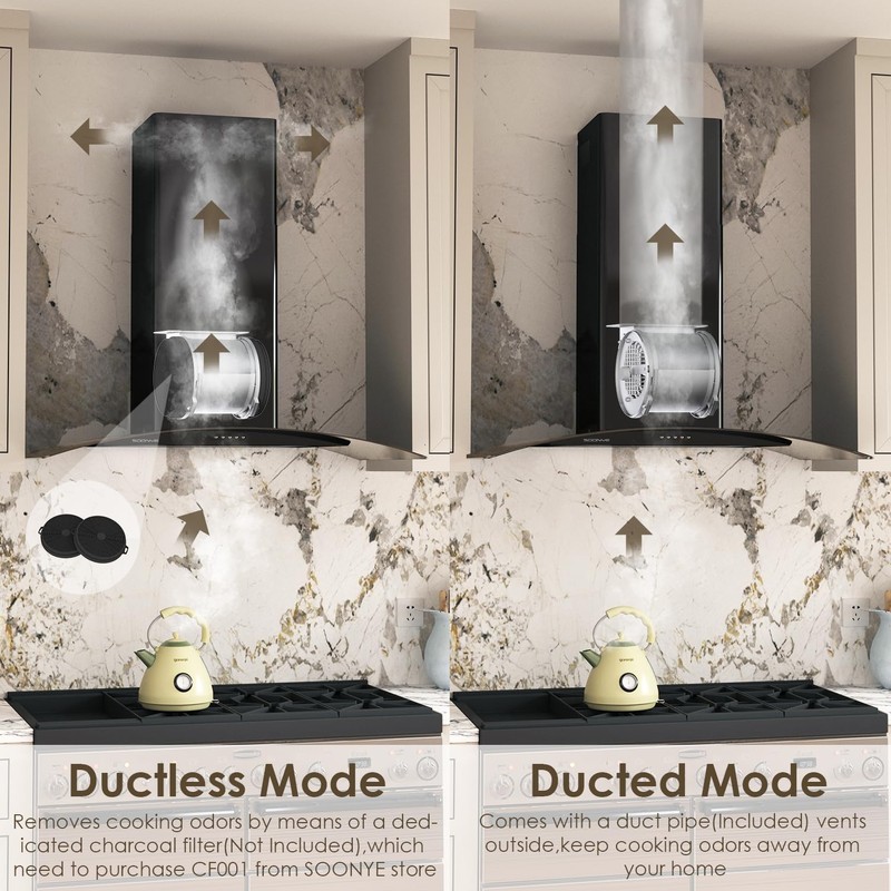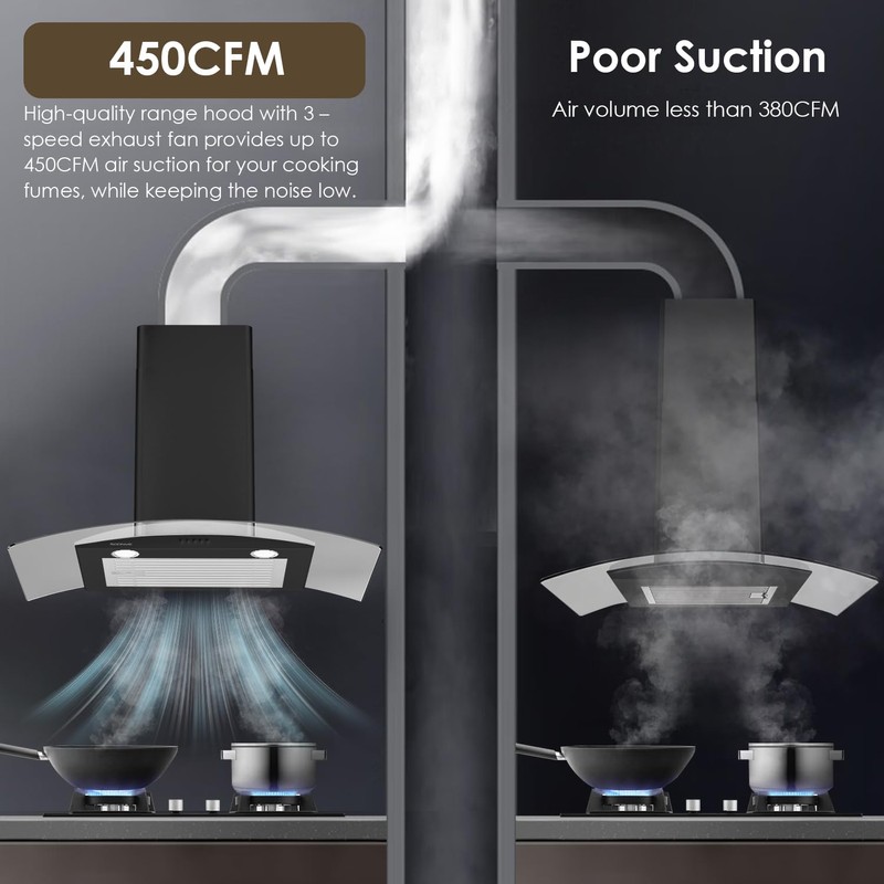 - 【3-Speed Efficient Airflow】--The 30-inch wall-mounted range hood is equipped with a powerful motor, has 3 different speeds, and the maximum airflow is 450CFM, which can quickly remove the cooking fumes and harmful substances, thereby reducing the damage to the skin and health.Converts to ductless range hood with Carbon Filter Kit Purchase Part # CF001 (Sold Separately)