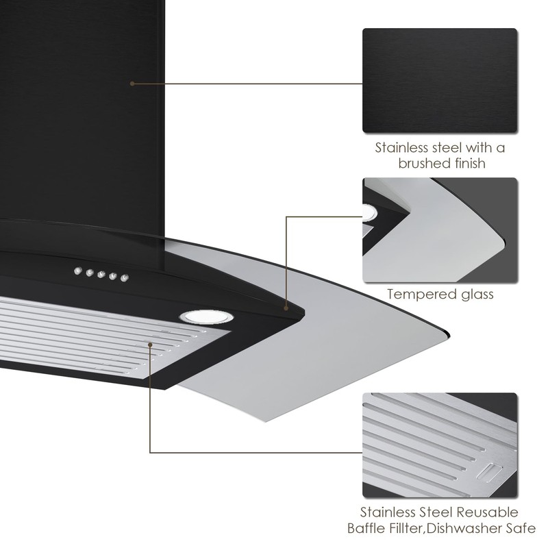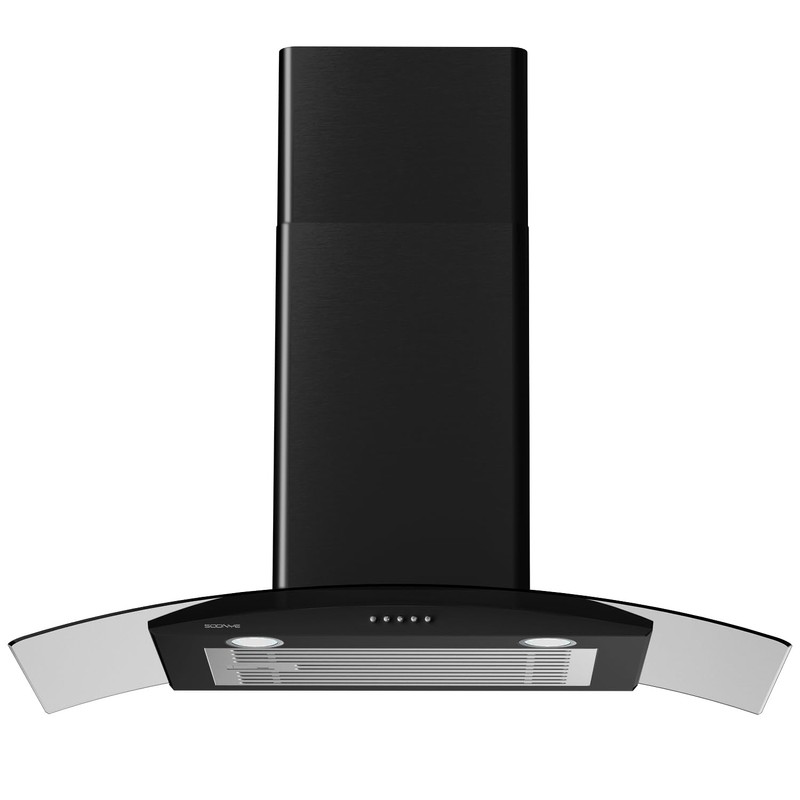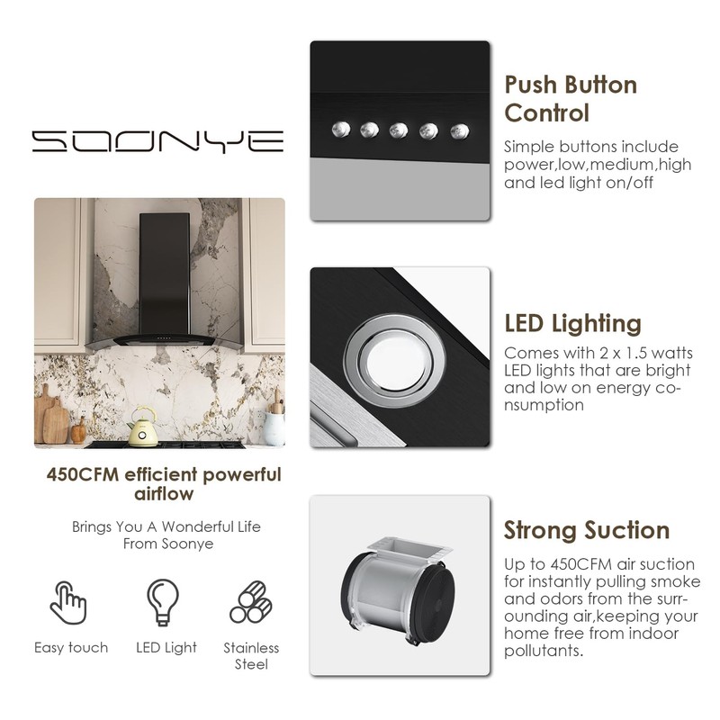 SOONYE 30 Inch Black Range Hood Wall Mounted Curved Glass Range Hoods with 450 CFM, Stainless Steel kitchen Ductless/Ducted Convertible with 3 Speed Controls, Permanent Baffle Filters and 2 LED Lights