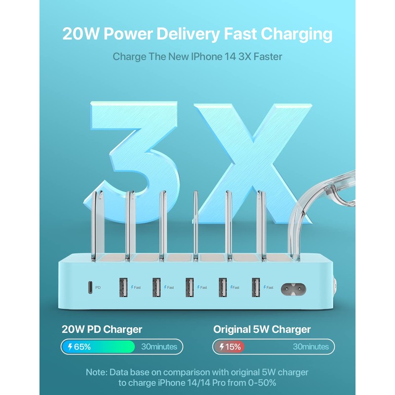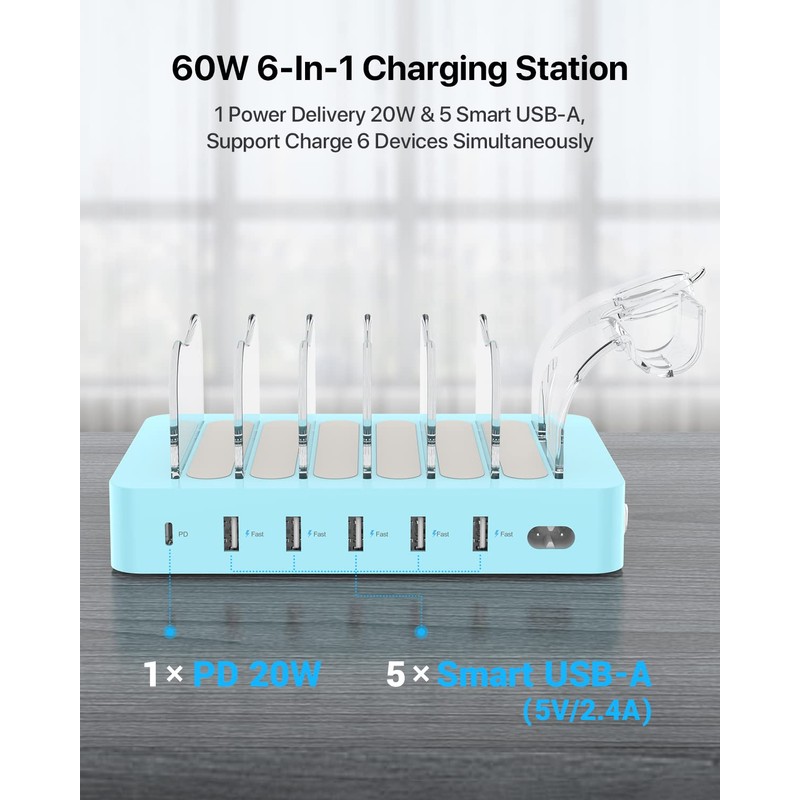 - 【CHARGE & CLEAN & ORGANIZED】NO more cluttered cables, NO bunch of chargers, everything in one place, clean and organized. Blue color with Hard-wearing matte finish, light-blue LED, Space Grey Silica gel Strips, combine to make this a truly Premium Charging Station. Designed to fit anywhere, company, office, boardroom, home, living room, bedroom, kitchen, hotel, restaurants, classroom.