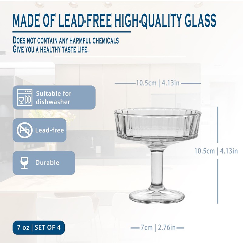 - Generous 7-Ounce Capacity– Ideal for espresso martinis, champagne, and mixed drinks. Set of 4 versatile glasses for both beverages and creative appetizers.