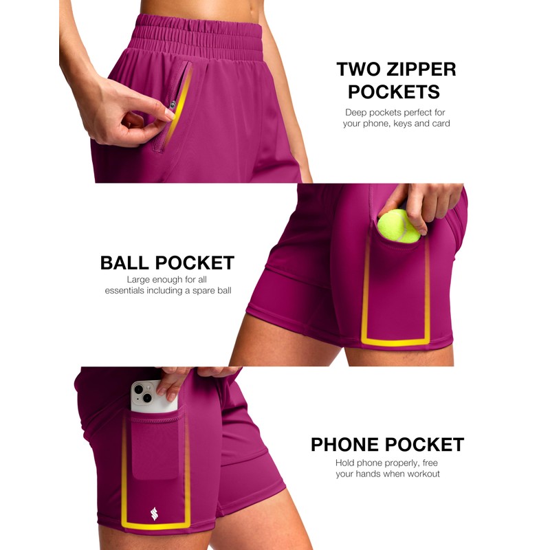 - 4 bolsillos grandes: 2 bolsillos externos con cierre para un acceso rápido al efectivo, llaves u otros elementos esenciales, además de dos bolsillos ocultos integrados en los lados del forro debajo del pantalón corto para pelota de tenis y almacenamiento del teléfono celular. Estos pantalones cortos activos para mujer tienen 4 bolsillos profundos, ofrecen comodidad y seguridad.