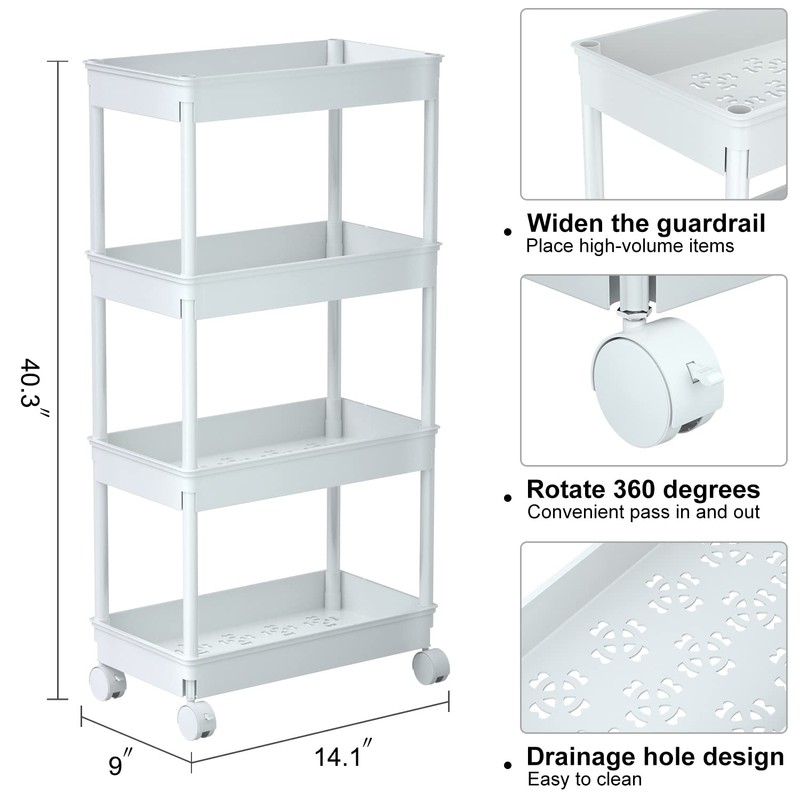 - Flexible 4 Tier Wide Storage Cart:The rolling cart with wheels(360°rotating ) The storage cart can be moved to any corner of the house to store items,can be used in tight spaces in your home for storage.