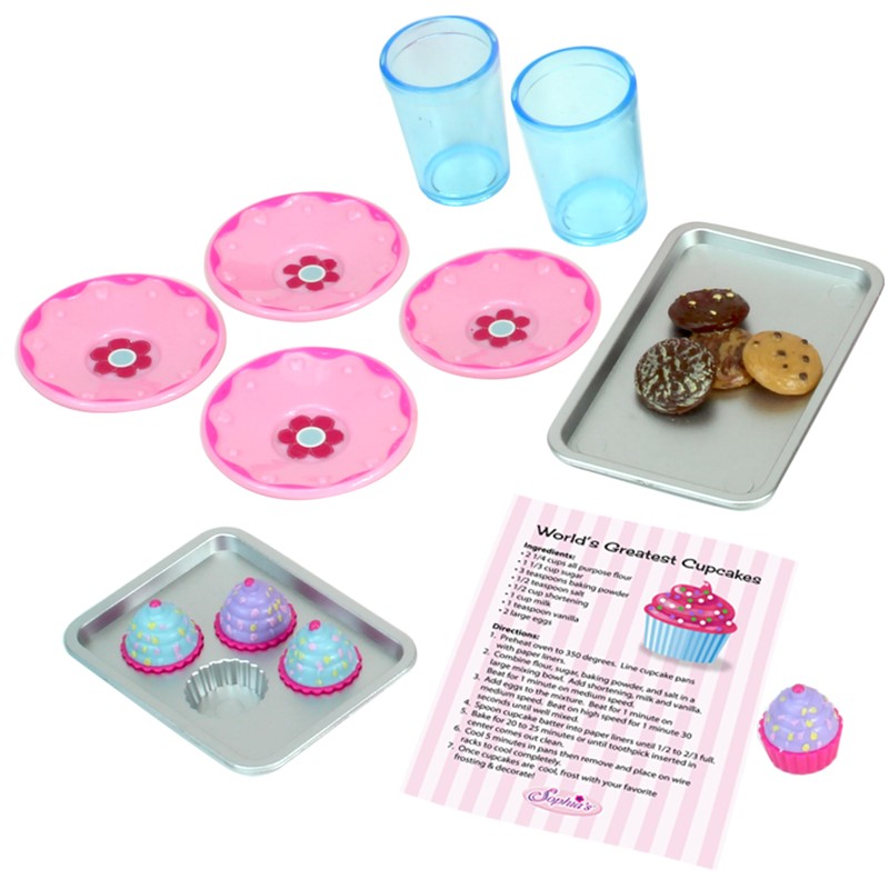 - ACCESSORIES INCLUDED: Baking Tray, 4 Cookies, 4 Cupcakes, Cupcake Recipe, Cupcake Tray, 2 Cups, 3 Ingredients Canisters, Measuring Cup, Measuring Spoons, Mixer, Mixing Bowl, Mixing Spoon, 4 Plates and Spatula