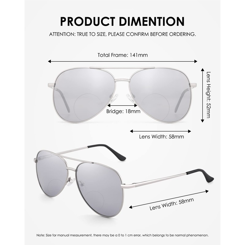 - Bifocal Sunglasses: Having the functions of sunglasses and reading glasses in one, eliminating the need to carry sunglasses and reading glasses at the same time. This sunglasses is great for blocking the sunlight and it doesn't block your view at the same time. Oversized frame makes it easy to use bifocal parts when needed, without having to take sunglasses off.