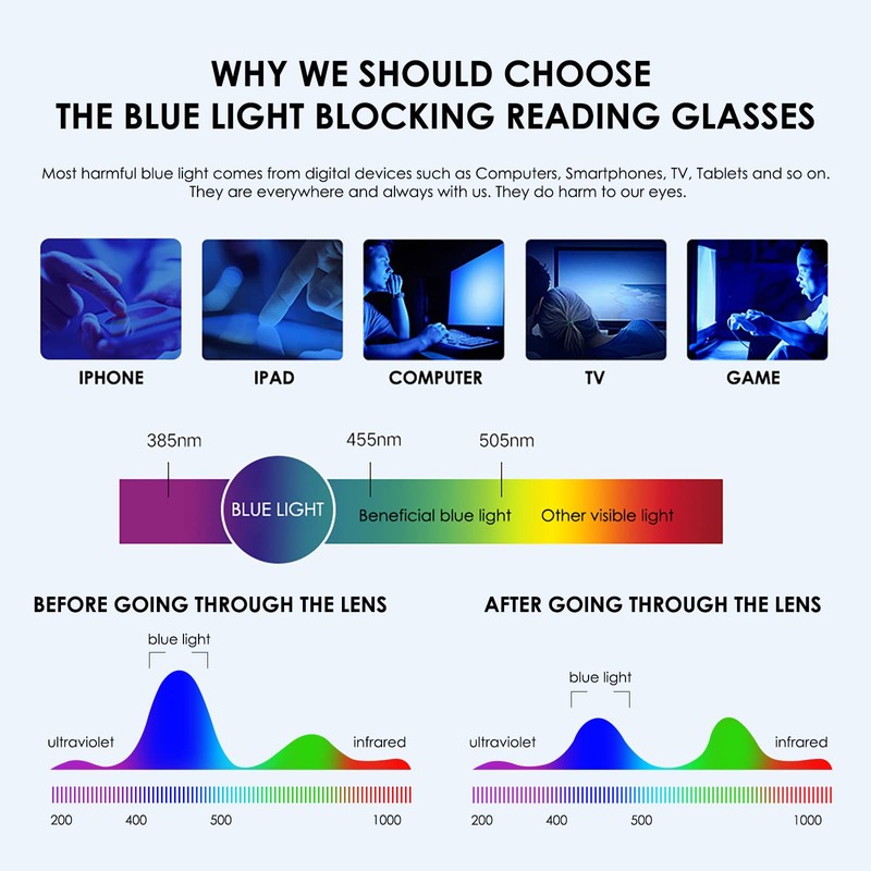 - Blue light blocking reading glasses - The trendy women reading glasses are made of blue light blocking lens, they are not only the eyeglasses to read books and papers, but also can be used to watch TV, browse computer, tablet and smart phone. These large readers can filter 100% of UVA and UVB rays, blocking harmful blue light coming from digital devices