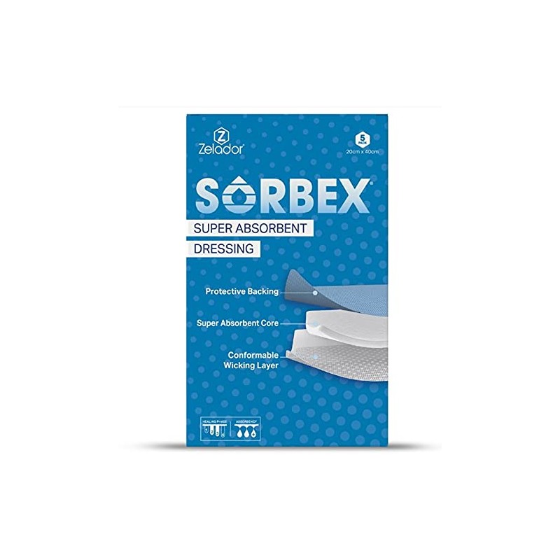 - Our Sorbex super absorbent dressing is designed for moderate but mainly high exuding wounds. Comprising of a protective backing to prevent strike through, this dressing can absorb 180g per 100cm of fluid exudate