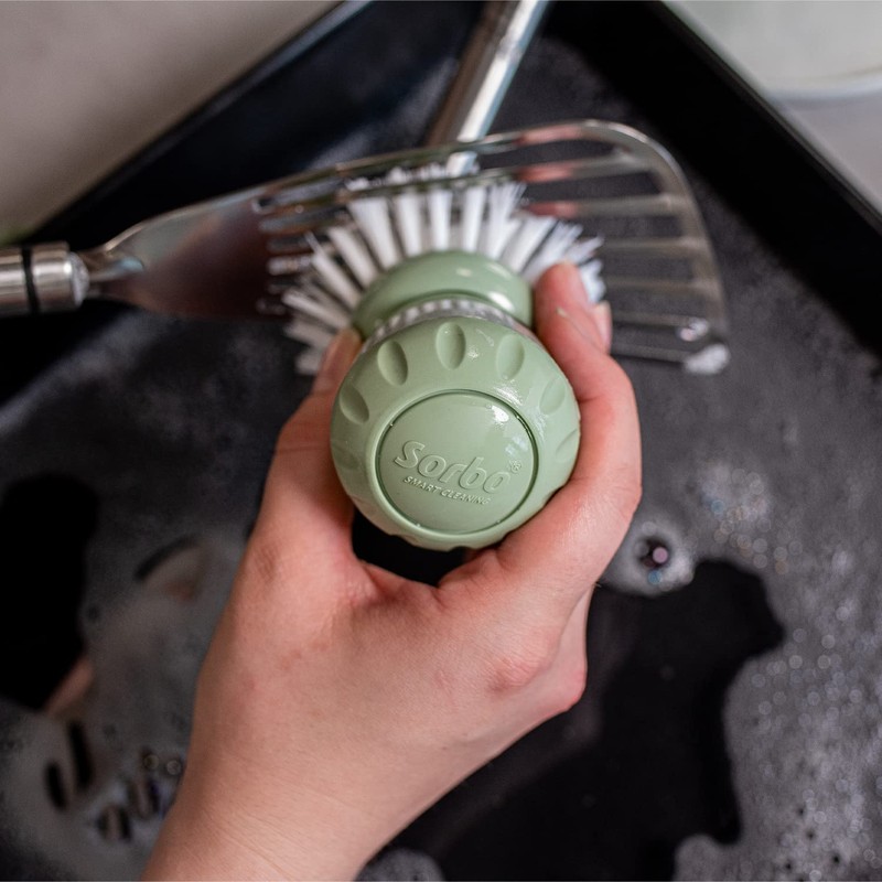 - The Sorbo Dispensing Pot Brush has nylon bristles which are strong, durable and heat resistant.