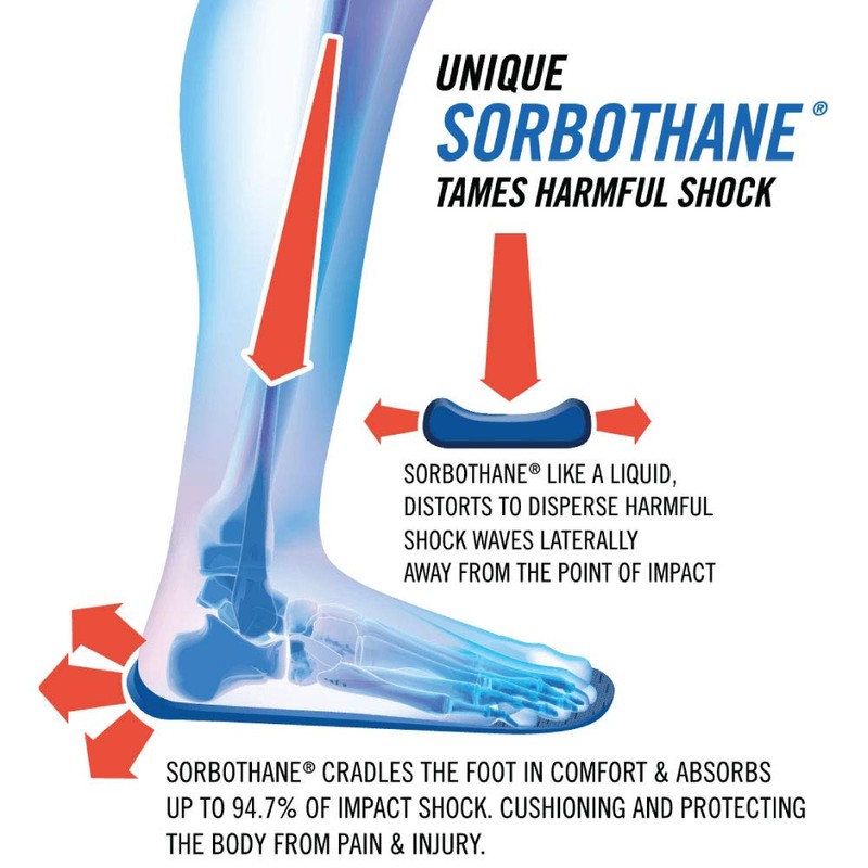 Sorbothane Heel Pads Sorbothane Heel Pads are designed with 100% Sorbothane material, providing you with 94.7% shock absorption. Made in the USA Thickness at heel: 4.6 mm Weight: 0.5 oz (Medium, Men's 6.5-10.5 / Women's 9-12)Ideal For: Shoe type: Athletic, Boots, Casual, Dress, Fashion, Flats, Open-toed Activity type: Running & Walking, Standing, Casual Pain relief: Heel Spurs & Heel Pain