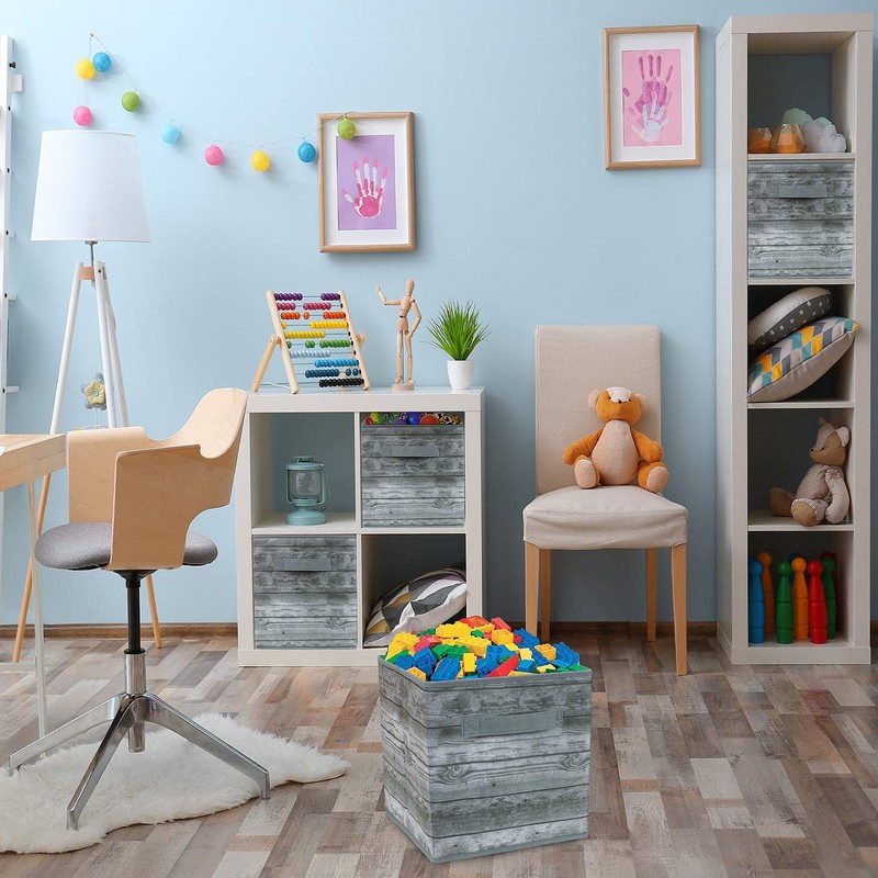 - DESIGN SPECIFICATIONS — Material is Nonwoven polyester and cardboard — Charming wooden crate inspired pattern in rustic gray — Complements cube storage organizer shelves — Side handles allow for easy transportation — Measures approximately 10.75” L x 11” H x 10.75” W