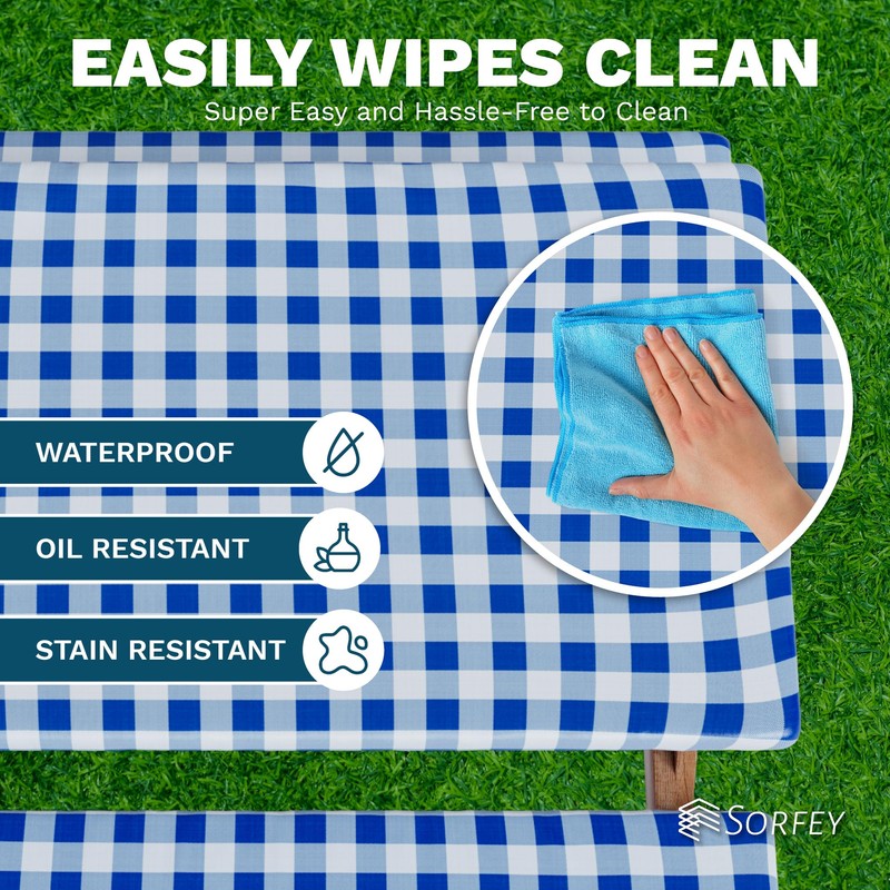 - FITTED TABLECLOTH FOR SECURE FIT- The Sorfey Picnic Table Tablecloths were designed to stay on the table even under windy weather, so that nothing keeps you back from enjoying your outdoors dining. Set includes: 1 tablecloth and 2 bench covers.