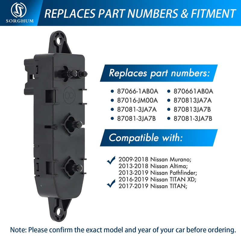 - Vehicle Fitment - Sorghum automotive power recliner switch compatible with 2009-2018 Nissan Murano, 2013-2018 Altima, 2013-2019 Pathfinder, 2016-2019 TITAN XD, 2017-2019 TITAN. If you are not sure the power seat controller is fit for your model, please contact us at any time.