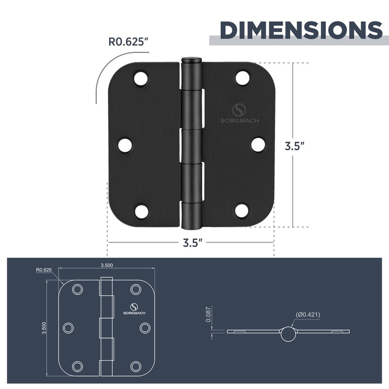 - 【Specification Size】Full Mortise & Loose Pin operating Plain Bearing Hinge 5/8" Radius. The black door hinges is 3 1/2 x 3 1/2 inches and 0.087 inches thickness. The door hinges pack include 30 black hinges and screws. Door hinges are made of high-quality reliable flat iron with a protective matte black finish.