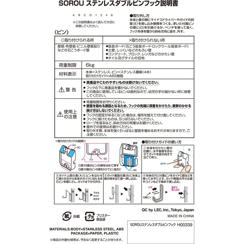 SORO:U Stainless Steel Double Pin Hooks, Pack of 2 (Load Capacity: 13.2 lbs (6 kg), 18-8 Stainless Steel, Installation Guide Included