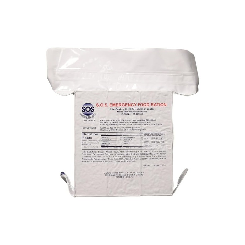 15, 075 KJ. 3600 kcal per package. High energy value. Ready to eat. Perfect for anyone in the process of building a disaster/ emergency kit. The SOS emergency food rations are US Coast guard approved and has a shelf life of 5 years from the date of manufacture. Content: Each package contains 9 delicious bars providing 410 calories per bar totaling over 3600 calories per package. Non-thirst provoking Formula offers maximum survival capacity with drinking water restriction under all environmental conditions. Directions: Eat three food bars per person per day.