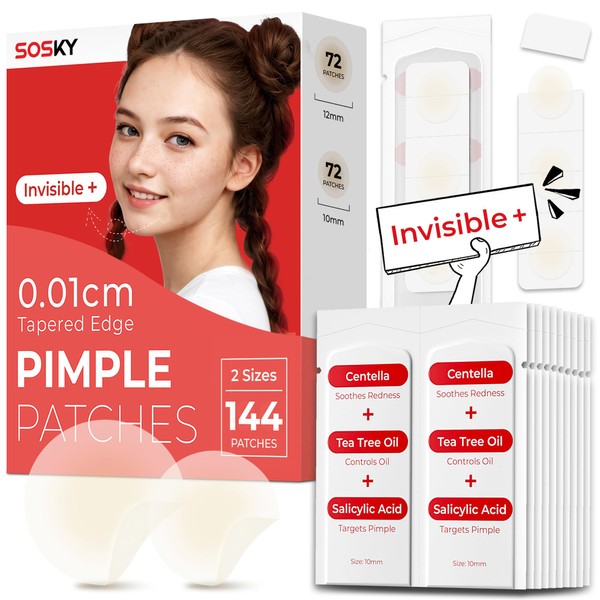 Sosky Pimple Patches for Face, 0.01 Invisible+ Hydrocolloid Acne Patches, Zit Sticker for Face and Skin, Pimple Patches for Covering Zits, Blemishes with Salicylic Acid 2 Sizes 144 Count