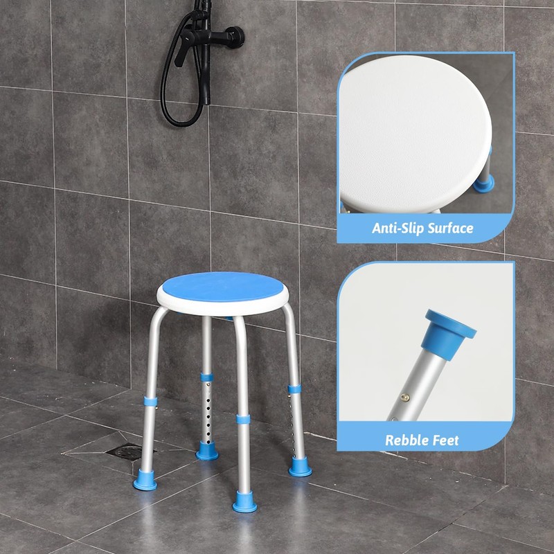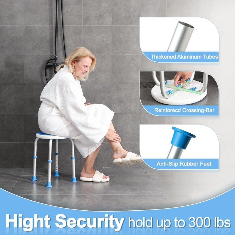 - 【Lightweight Yet Sturdy Construction】Our waterproof shower stool for in-shower use is constructed with a lightweight aluminum frame, weighing only 3.13lbs for effortless portability. Despite its lightness, it can support up to 300lbs. With 1.4mm thick aluminum tubes and a cross-bracing design, this small shower chair is both durable and resistant to deformation. An ideal choice for long-term use, without compromising your shower quality due to rust or damage.